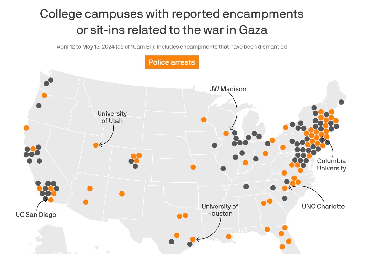 Lesson #1. The same pattern appeared across the entire United States over the past month. According to the news site Axios, between April 12 to May 13 police raided 55 college campus encampments and made over 2000 arrests. Like similar assaults on the Occupy Movement a decade ago, these raids came late at night, were often violent, and relied on flimsy legal charges. In the case of UCLA, the students were guilty of “suspicion of failing to disperse.” The LA Times reported the police wore body armor, helmets, face shields, and fired many flash-bang grenades.