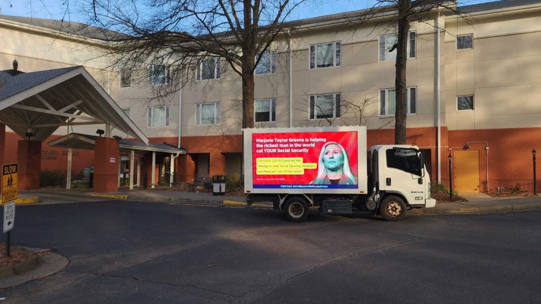 That's what Marjorie Taylor Greene thinks of Trump's campaign promise to protect earned benefits—and we're going to make sure her constituents know it. My organization, Social Security Works, just sent a billboard truck to drive to every large senior center in her district, reading "Marjorie Taylor Greene is helping the richest man in the world cut YOUR Social Security" and urging voters to call her office.