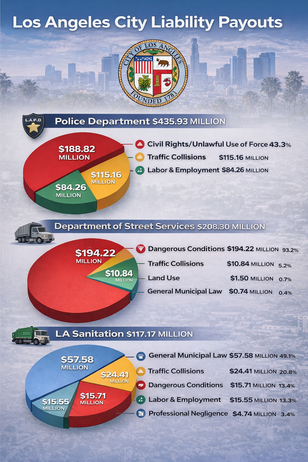 The top three City Departments that rank the highest in liability claims are the LA Police, Street Services, and Sanitation.
