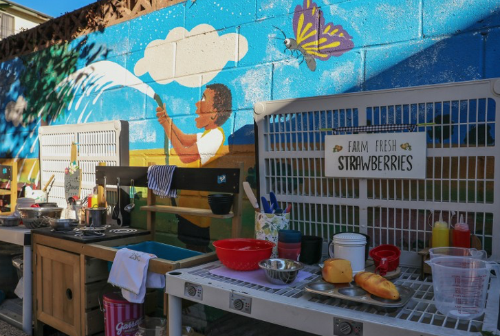 A “mud kitchen” for children to play at Tonya Muhammad’s child care in Hawthorne on Oct. 28, 2021. Photo by Zaydee Sanchez for CalMatters