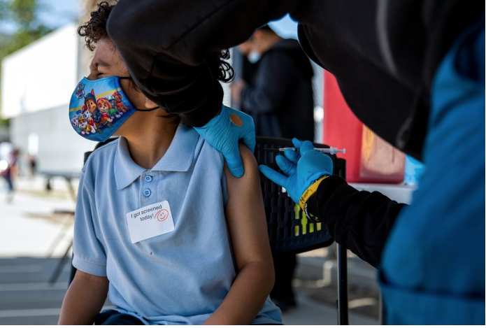 Jayden Elizondo, 5, gets a Covid-19 vaccination at one of St. John’s Well Child and Family Center mobile health clinics in Los Angeles.