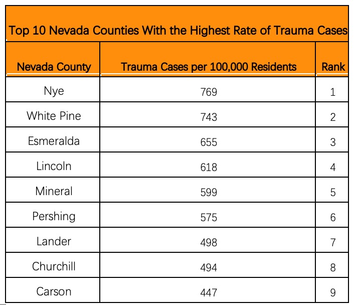 - Nye County has the highest trauma rate in Nevada, with 769 cases per 100,000 residents.