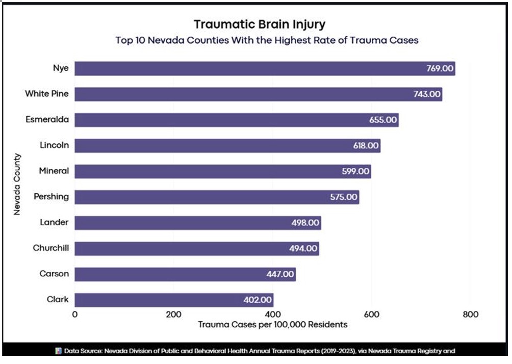 "The study highlights that counties such as Nye, White Pine, and Esmeralda reported some of the highest trauma rates in Nevada.