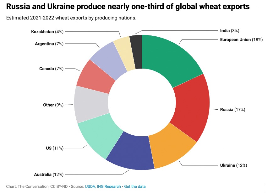 Together, Russia and Ukraine account for almost 30% of total global exports of wheat, nearly 20% of global exports of corn (maize), and close to 80% of sunflower seed products, including oils. The war has largely shut off grain exports from Ukraine and is affecting Ukrainian farmers' ability to plant the 2022 crop. Planting there in 2022 is expected to be reduced by nearly a quarter.